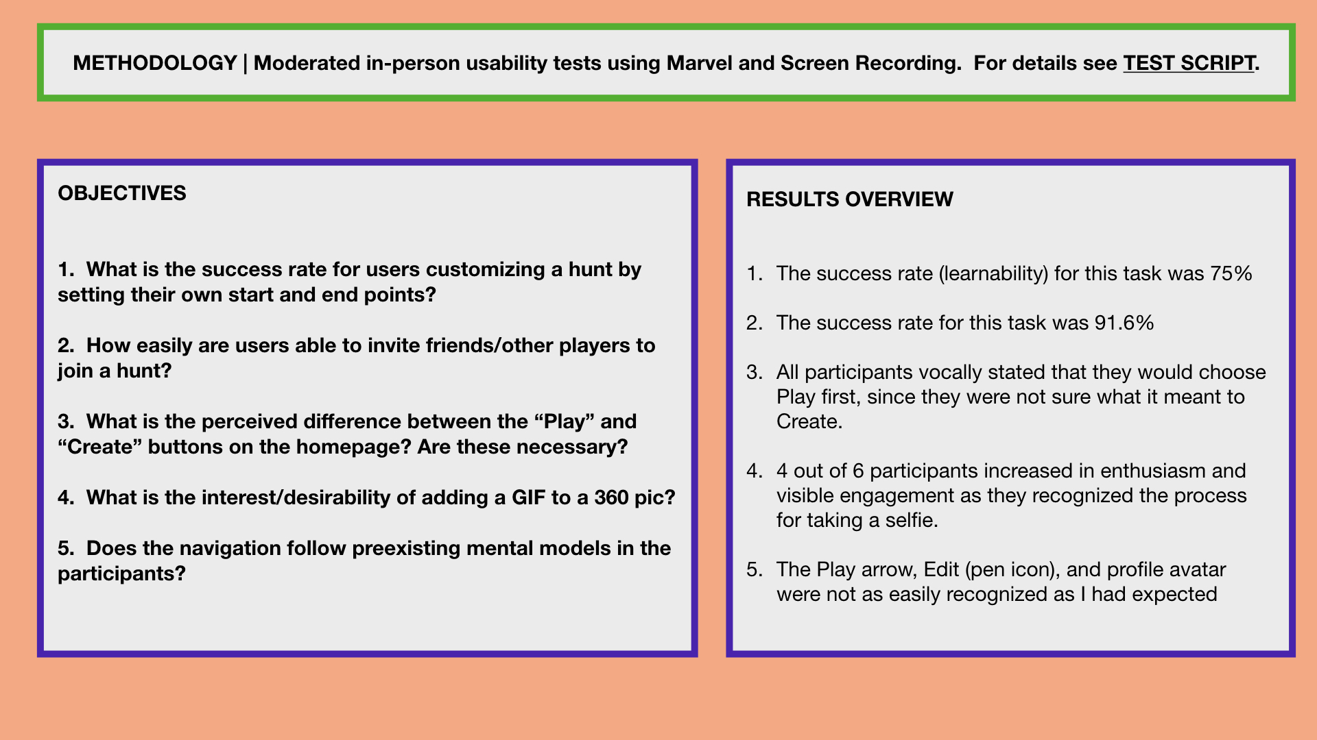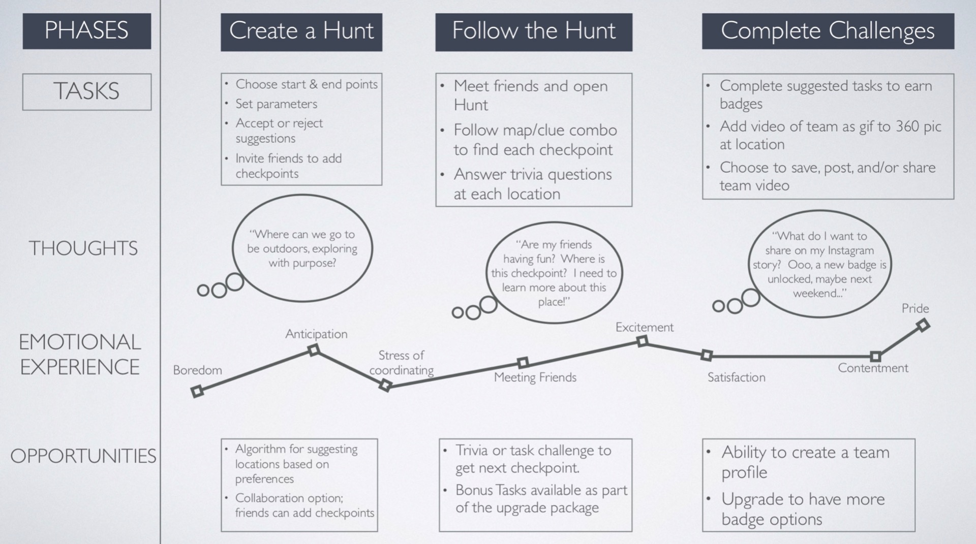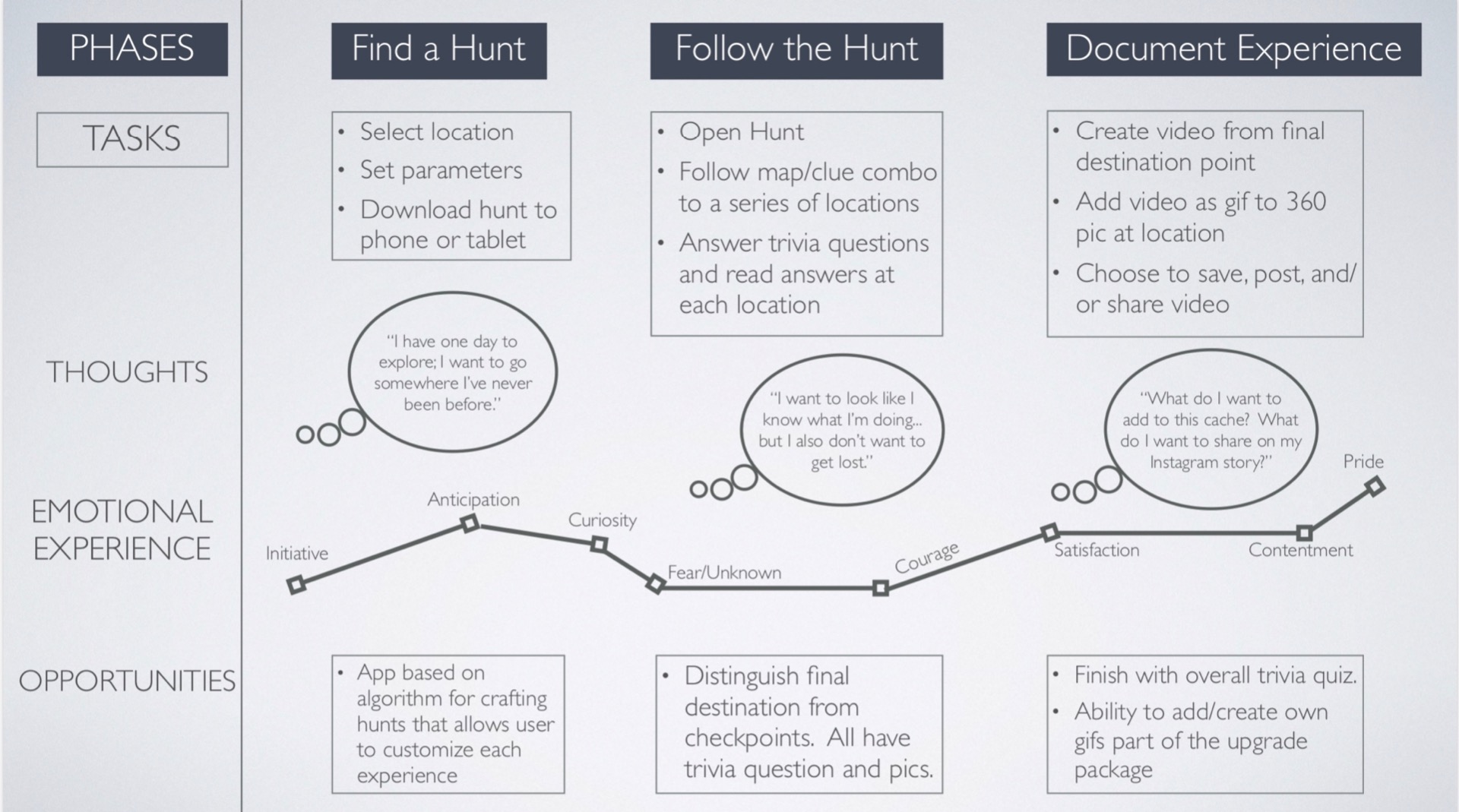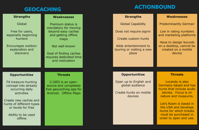 I selected two of these apps, Geocaching and Actionbound, and completed a market comparison and SWOT analysis of their strengths, weaknesses, opportunities, and threats. The need for scavenger hunt creation on a mobile device stood out as a clear area of opportunity, and guided the direction for further user research.