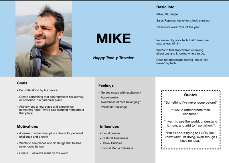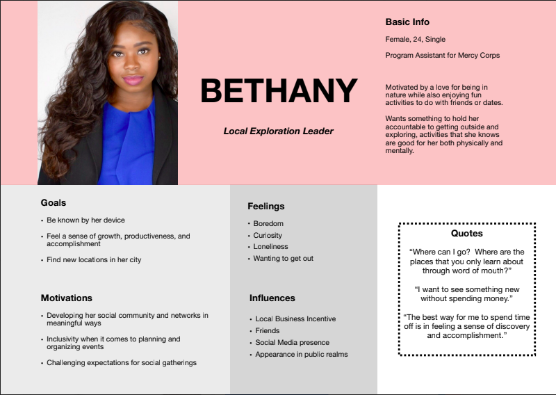 Considering my user interviews and broad target audience, I crafted two user personas that narrowed down on a more specific audience range for the app. These user personas involved one who was a constant traveler, looking to create content on the go, and the other who remained local but sought to explore her urban environment with friends.