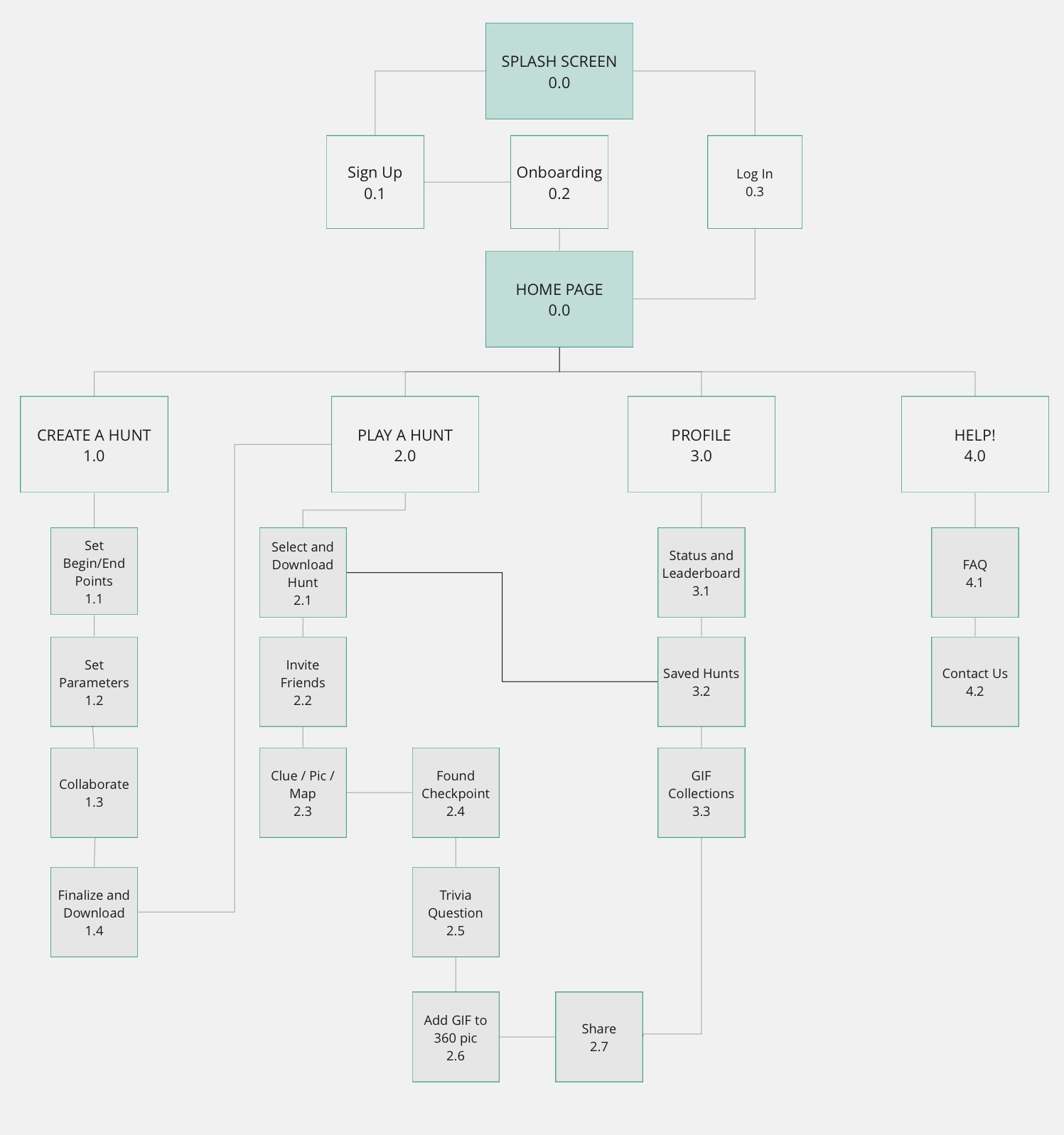 The initial IA for the app followed a fairly strict hierarchy, with the idea that a user would know which of the tasks they were intending to perform when they opened the app. Clicking on PLAY from the home page, for example, would result in a process that most quickly allowed a user to begin playing a hunt. Later on, as you'll see, this sitemap changed in response to user testing and feedback.