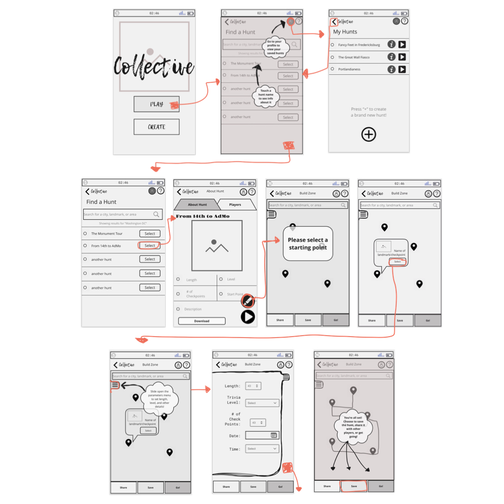 As I began to transfer my work up to this point, I realized the need to significantly rework my initial IA for the app. I removed the assumption that users would encounter the app with a known task in mind, and tried to create a more seamless flow that would guide a user through the steps of hunt creation with as little friction as possible.