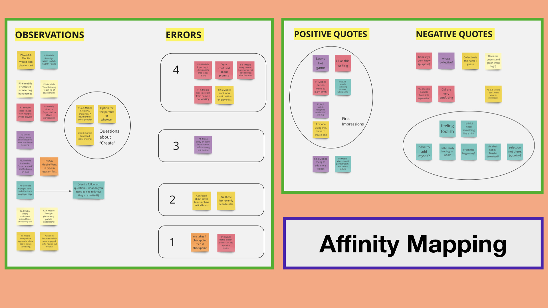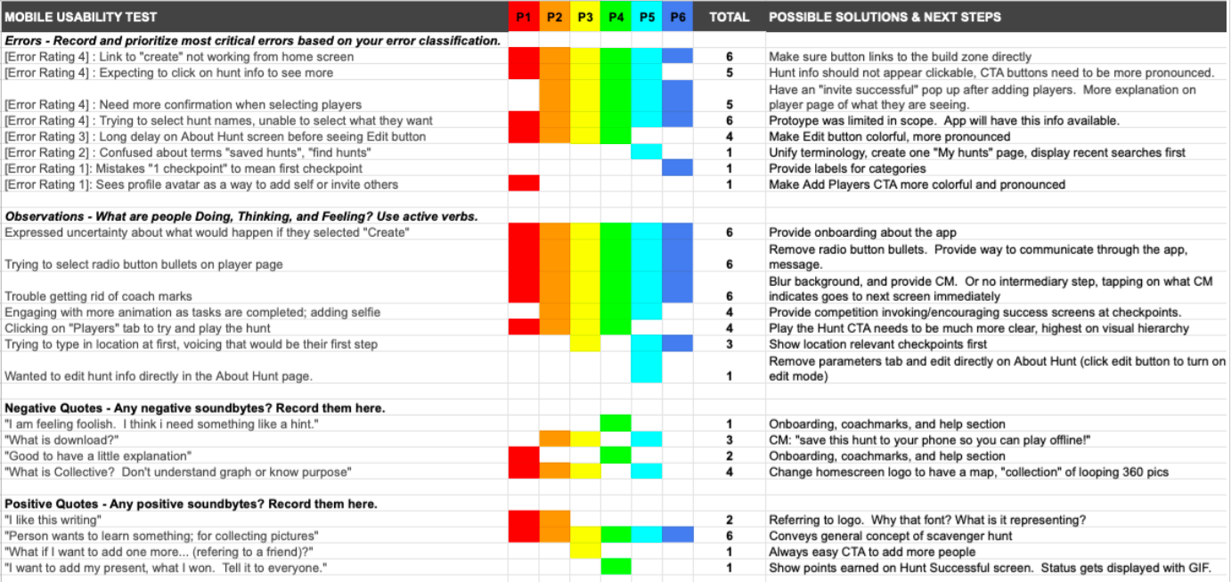 After conducting the tests, I analyzed the data using Affinity Mapping and a Rainbow Spreadsheet tool. In the Affinity Mapping process, I assigned a post-it note color to each participant, gleaned the screen recordings for insights and quotations, then grouped these into categories. In the Errors category, I assigned severity levels to help prioritize the order in which I began to make adjustments to the app, with 4 being the most critical and 1 being the least.