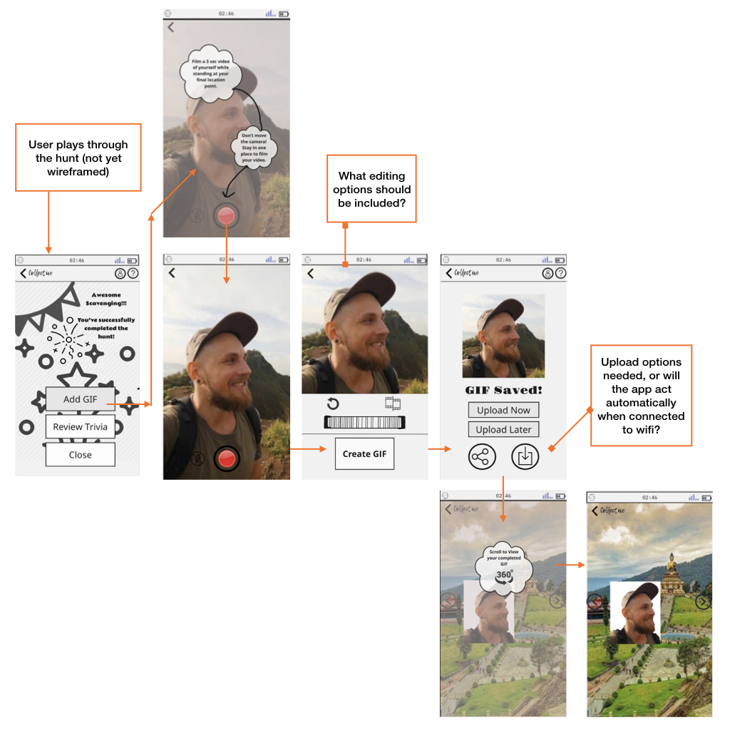 Mid-fidelity wireframe of a core feature: when users arrive at their destination, they can add a GIF of themselves to a 360 pic.